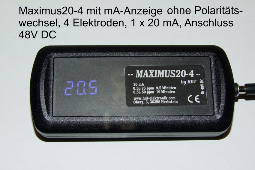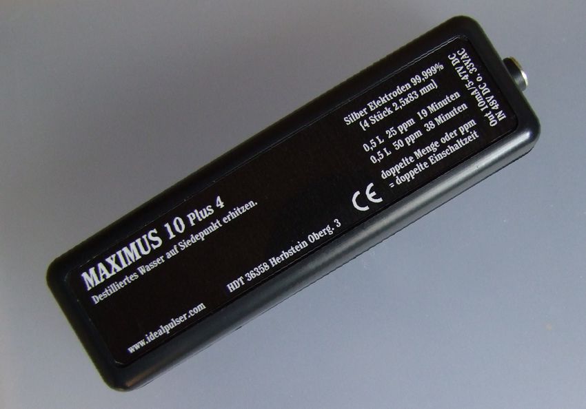 Nr. 40 MAXIMUS 10 Plus 4 Das Gerät arbeitet mit 48V Gleichspannung. Lieferumfang: 4 Silberelektroden 83 mm, 4 vergoldete Elektrodenstecker, Netzteil 48V DC, Kurzanleitung mit CE-Konformitätserklärung, ppm-Tabelle 10 mA und ein Untersetzer. 4 Silberelektroden 83 mm, mit Polaritätswechsel , Elektrodenstrom 1 x 10 mA.