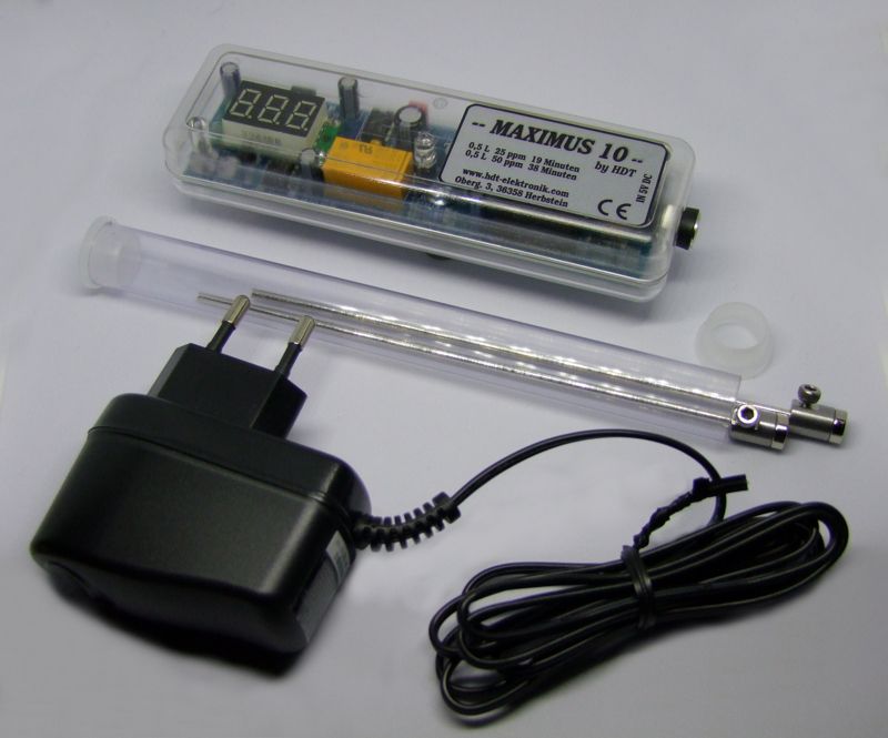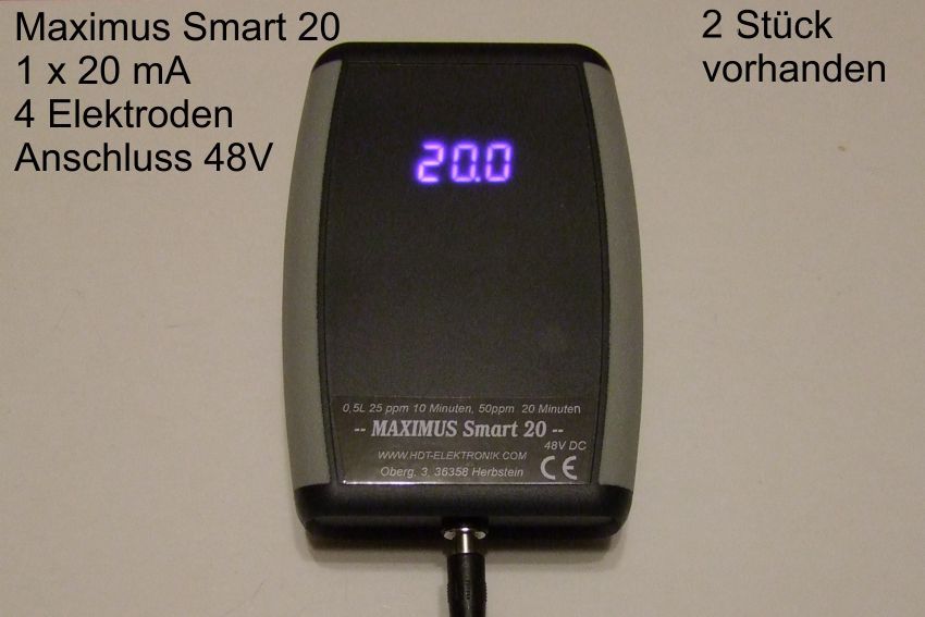 Nr. 32 Lieferumfang: Gerät ist komplett und entspricht der Serie. Es wurde lediglich repariert und hat geringe Gebrauchsspuren, 4 Silberelektroden 140 mm, magnetische Elektrodenhalter, Netzteil 5V DC, Bedienungsanleitung, CE-Konformitätserklärung, ppm-Tabelle 20 mA, Acryl-Untersetzer, 4 Silberelektroden 140 mm, mit Polaritätswechsel , Elektrodenstrom 2 x 10 mA.