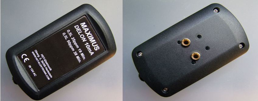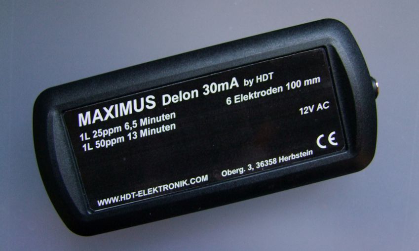 Nr. 37 MAXIMUS-Delon 2 x 20 mA Das Gerät ist höchst leistungsfähig, es wird mit einem Paar Silberelektroden 140 mm Länge geliefert. Damit gibt es 20 mA Elektrodenstrom ab. Es kann ein weiteres Paar Elektroden angeschlossen werden (nicht im Lieferumfang enthalten), dann beträgt der Gesamt-Elektrodenstrom 40 mA. Das Gerät arbeitet mit 12V Wechselspannung, und kann nicht mit Gleichspannung betrieben werden. Das passende Wechselspannungsnetzteil wird mitgeliefert. Lieferumfang: 2 Silberelektroden 140 mm, 4 vergoldete Elektrodenstecker, Netzteil 12V AC, Kurzanleitung mit CE-Konformitätserklärung, ppm-Tabelle 20 mA, und ein Untersetzer. 2 Silberelektroden 140 mm, kein Polaritätswechsel , Elektrodenstrom 1 x 20 mA. (2 x 20 mA sind möglich)