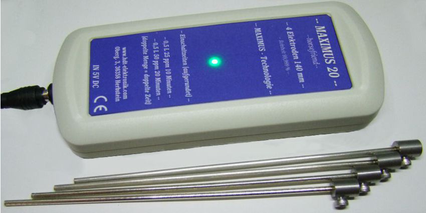 Nr. 15 Lieferumfang: Gerät, 4 Silberelektroden 140 mm, Netzteil 5V DC, Kurzanleitung, ppm Tabelle, CE-Konformitätserlärung mit mA-Anzeige, mit 4 Silberelektroden 140 mm, ohne Polaritätswechsel, Elektrodenstrom 1x 20 mA.