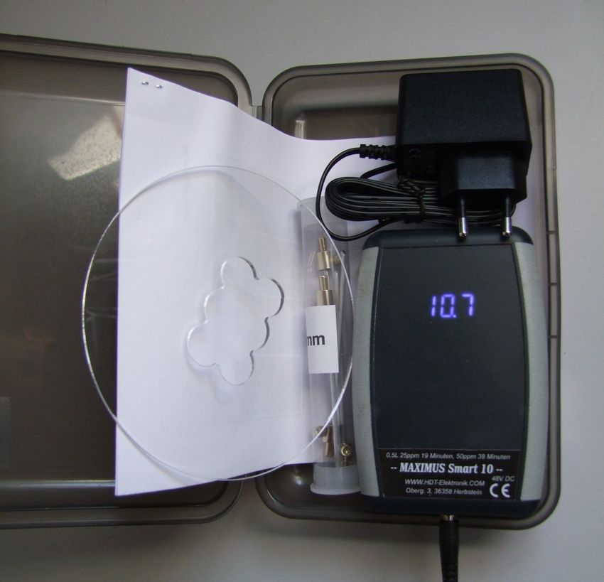 Lieferumfang: Gerät, 4 Silberelektroden 100 mm mit magnetischen Elektrodenhaltern, Netzteil 5V DC, Bedienungsanleitung und ppm-Tabelle für 20 mA, ein Untersetzer für das Glas. (wegen der kürzeren Elektroden auch für kleine Gläser geeignet) Polaritätswechsel , Elektrodenstrom 20 mA, komplett mit Netzteil und betriebsbereit.